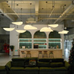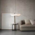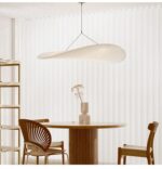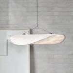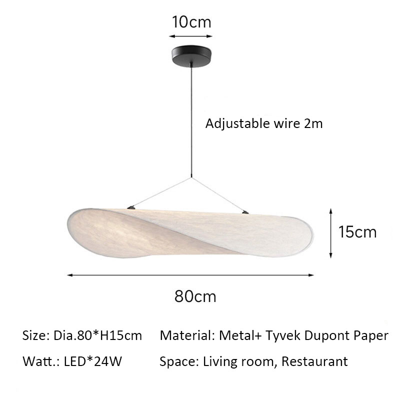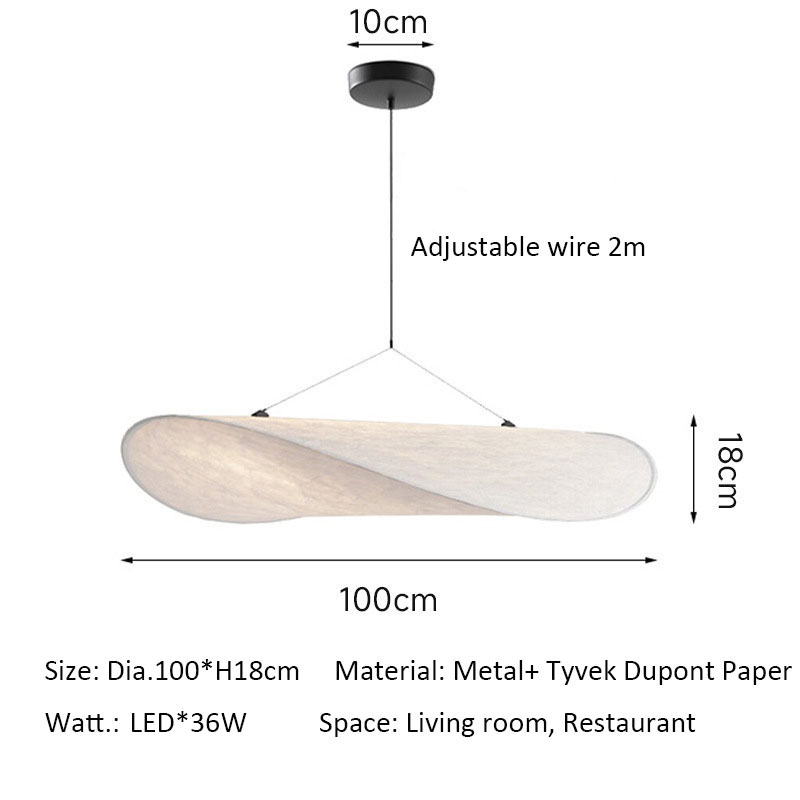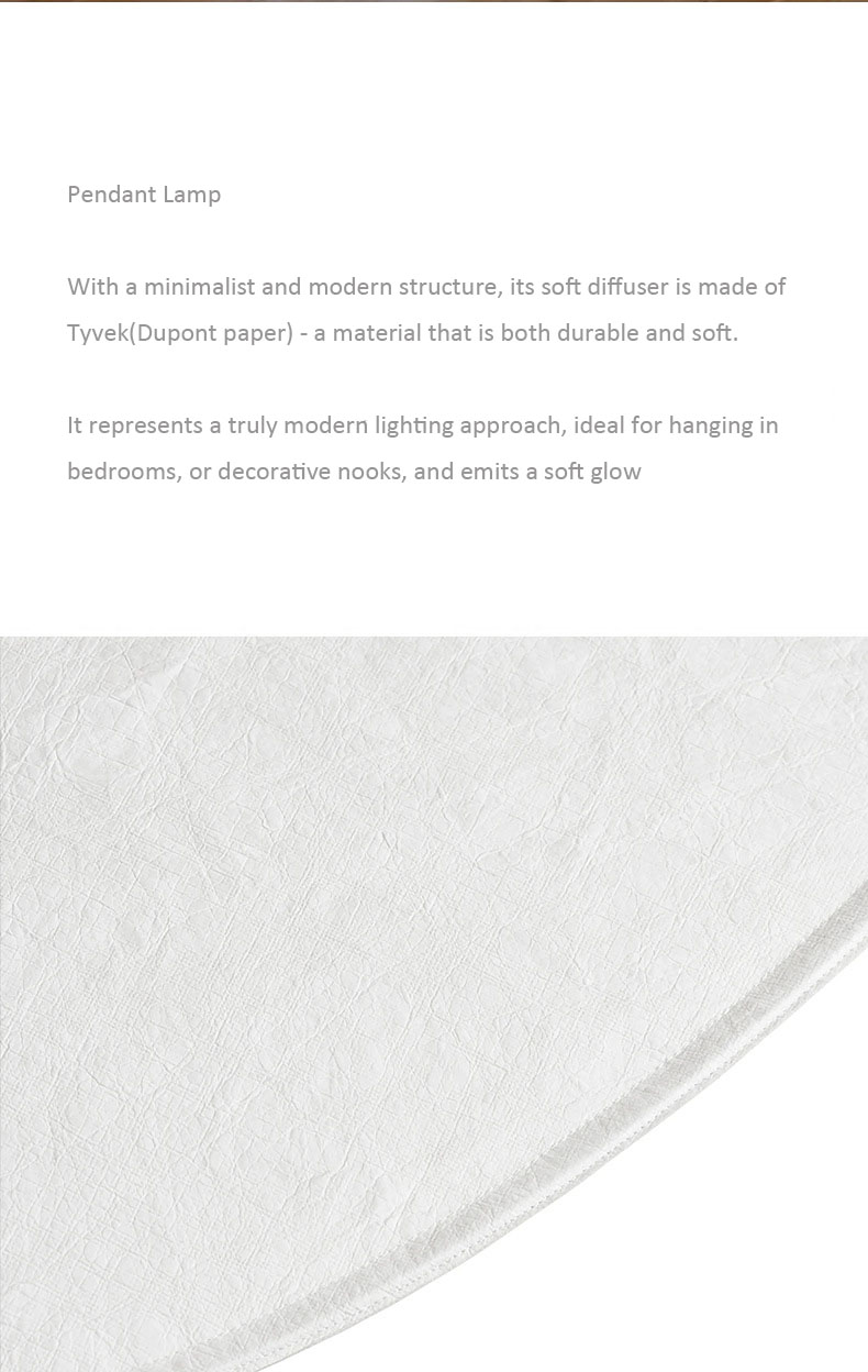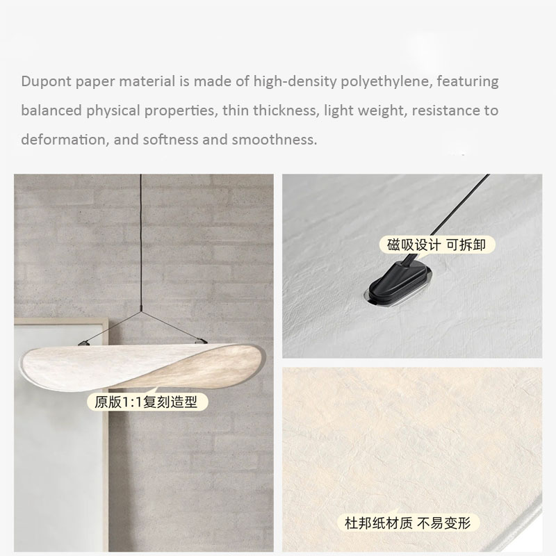 Tense pendant light is made of metal and Dupont Tyvek materials.