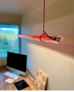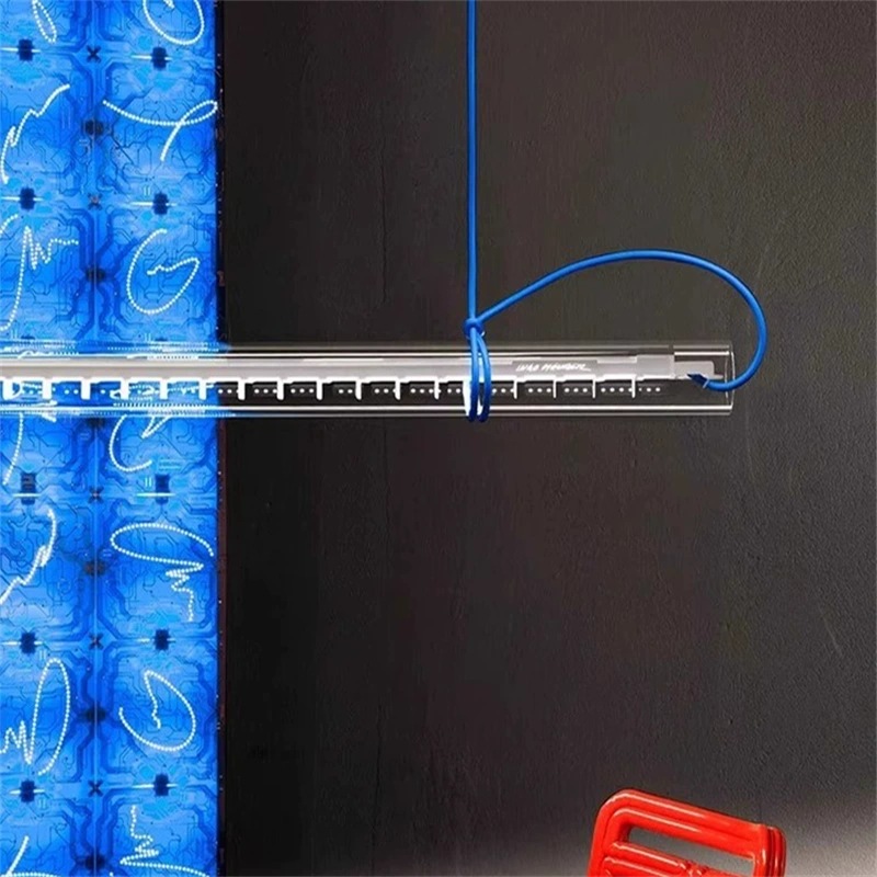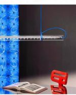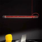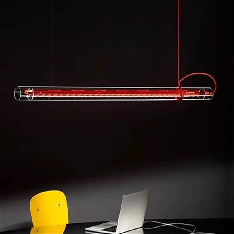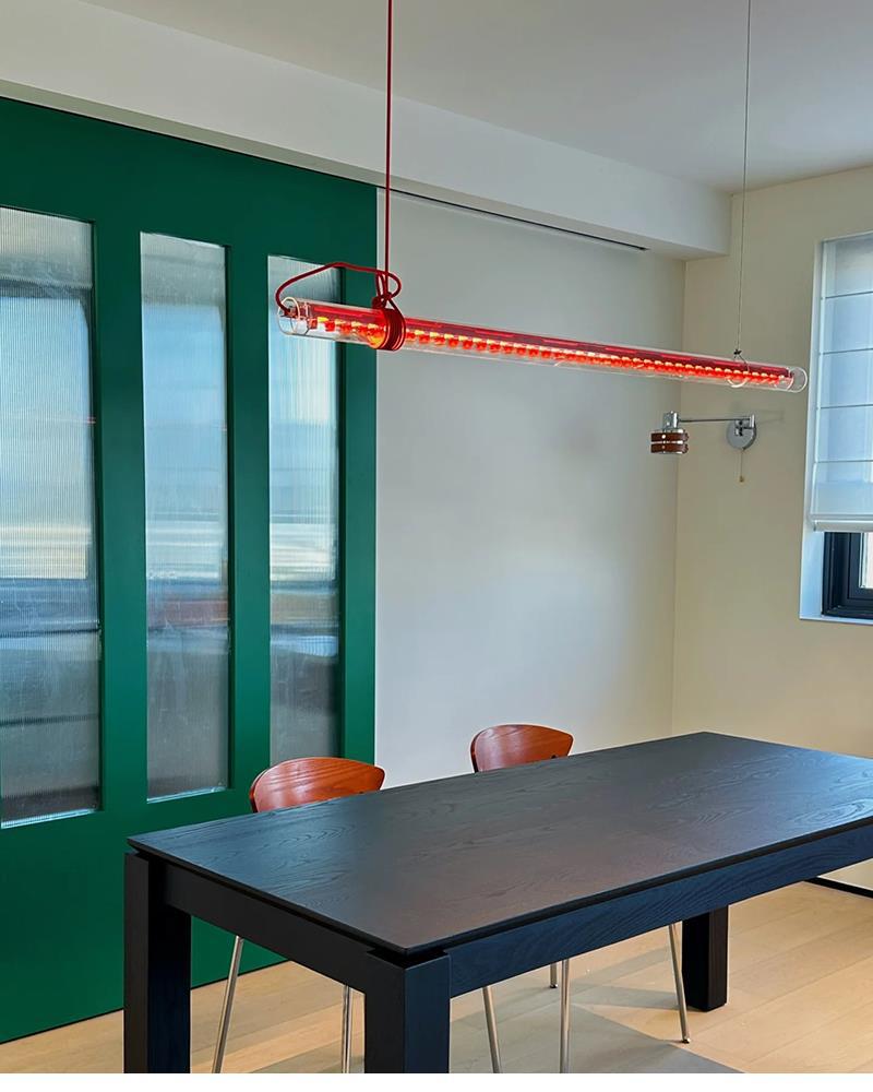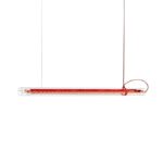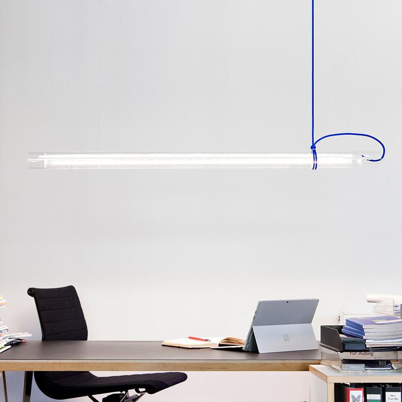 Tubular pendant light is made of glass, metal, textile cable and plastic.